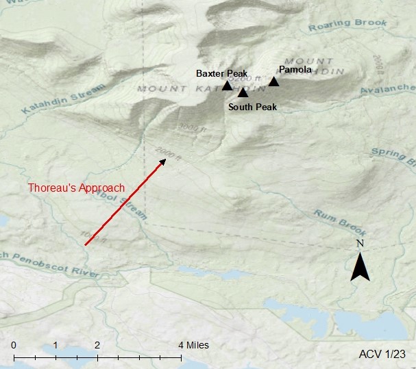 Katahdin is remote, and less developed and accessible than other northeast mountains. It took Thoreau a day to get from Concord to Bangor by train and steamboat and then nearly a week to travel by horse and wagon and boat (batteau) up the Penobscot River to its West Branch and eventually to the mouth of the Aboljacknagesic stream, “open-land stream” (Ktaadn, 63), where he camped before the climb.