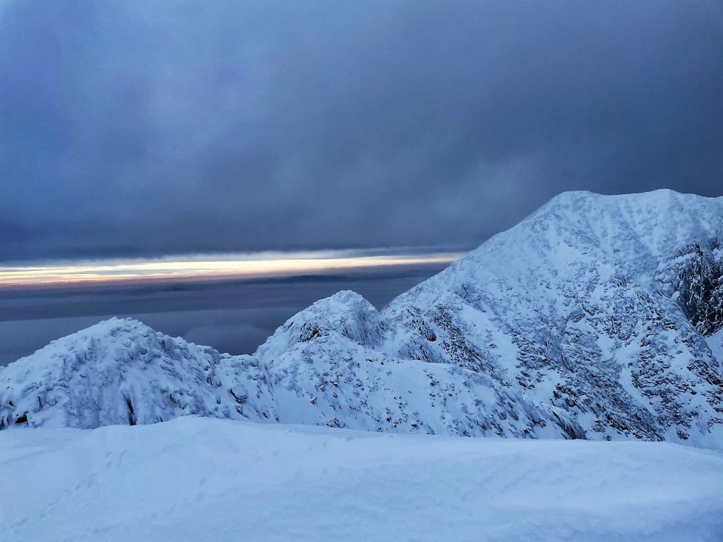 I admit that when the wind picked up on Pamola and threatened my balance, with momentary pause, Thoreau’s statement that the mountain is cursed crossed my mind. In the final analysis though, Thoreau only sees the awful aspect of alpine landscape. Mountaineers acknowledge the feeble capacity of humans to withstand nature’s power; yet as long as we find ourselves safe, we are capable of experiencing more than debilitating fear. So, after preparing ourselves for the changing summit conditions, when we stood up in the wind, we were invigorated as we continued up Pamola. Perhaps the feeling of the sublime in that circumstance is borderline insolent or hubristic. We felt great, but we agreed that continuing onto the Knife at that time would have pushed our luck too far.