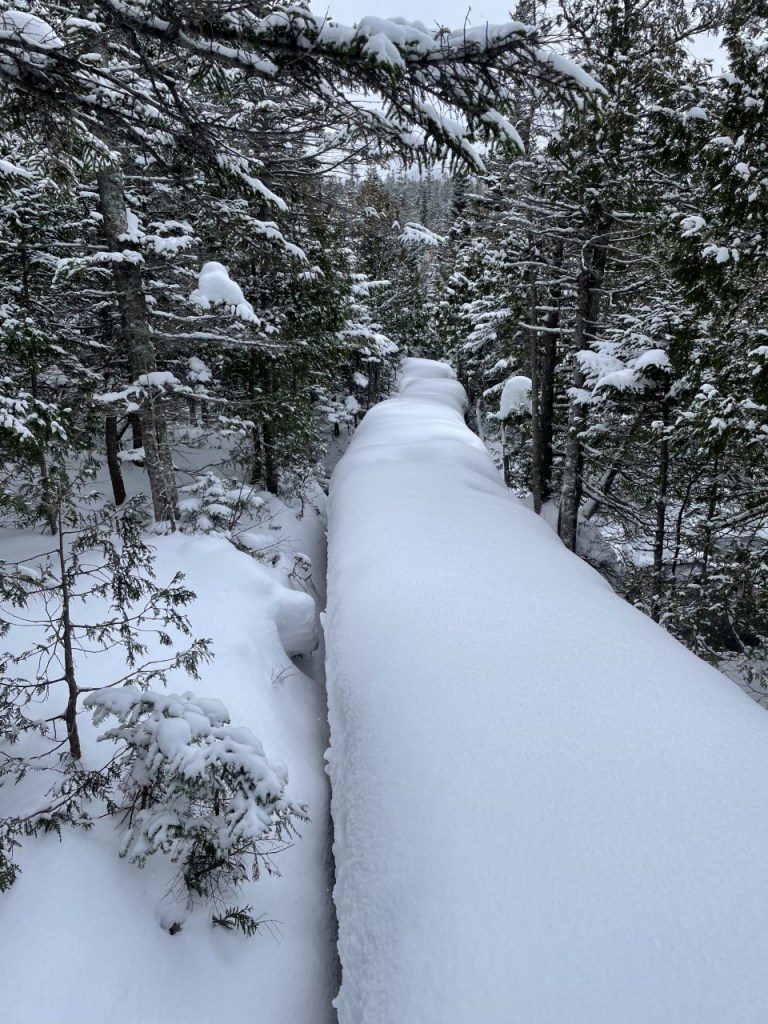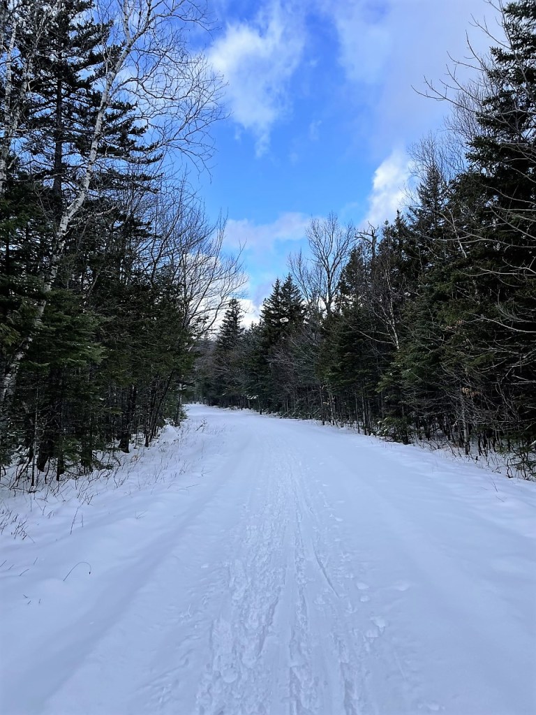 We were the first visitors of the ’22-’23 winter season. At this early date, the southern aspect, low-elevation slopes had very little snow cover, so we carried our skis on Abol Stream Trail and until we reached Roaring Brook Road.