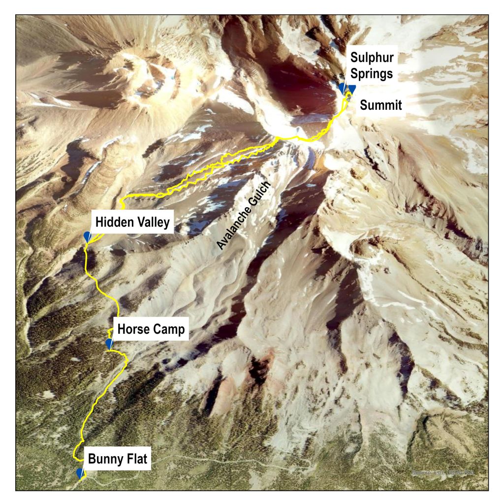 Muir’s favored plan would have been to start in Strawberry Valley (present day Mt Shasta City) ride to Horse Camp, and then, the next morning, make a direct line for the summit. Today, you drive to Bunny Flat. Other than that, Muir’s itinerary is pretty typical. Avalanche Gulch is the standard route.